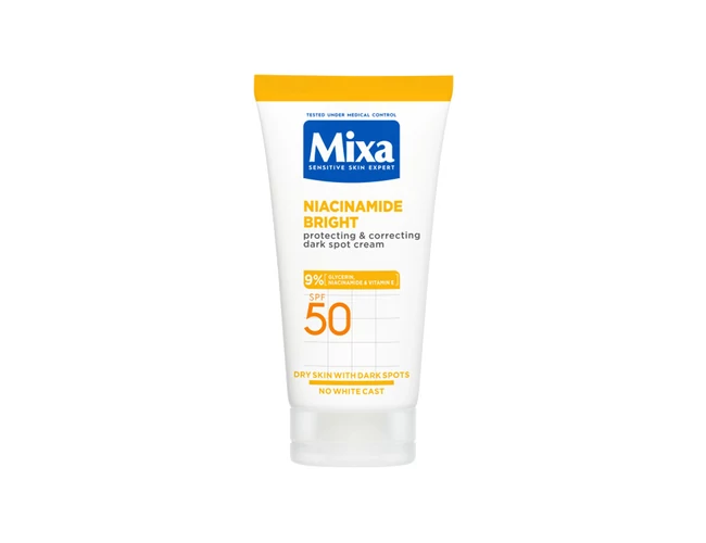 A Mixa Niacinamide Bright Védő és korrigáló krém sötét foltok ellen SPF 50 (50 ml) egy fejlett, bőrgyógyászatilag tesztelt arckrém, amely egyesíti a magas fényvédelmet és a bőrtónus-korrekciót.